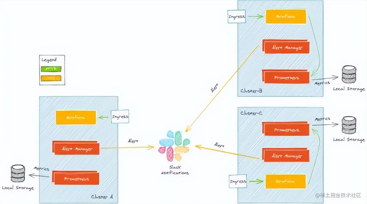 这种架构有一些注意事项,当你想从其中获取指标的集群数量增加时,它的伸缩性以及可扩展性不太好。