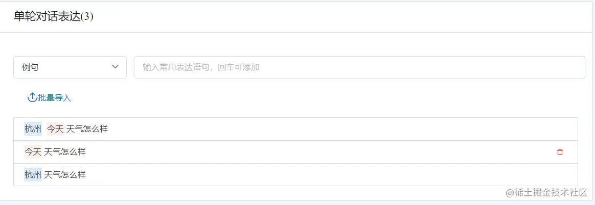 我们观察到了在意图的单轮对话表达式维护界面里,杭州 和 今天 这两个词都通过特殊的颜色进行高亮。这代表它们是对话表达式里的参数。显然,天气预报业务要针对具体的城市和日期才有意义,因此这些参数也需要被发送到应用开发人员编写的服务接口中去。