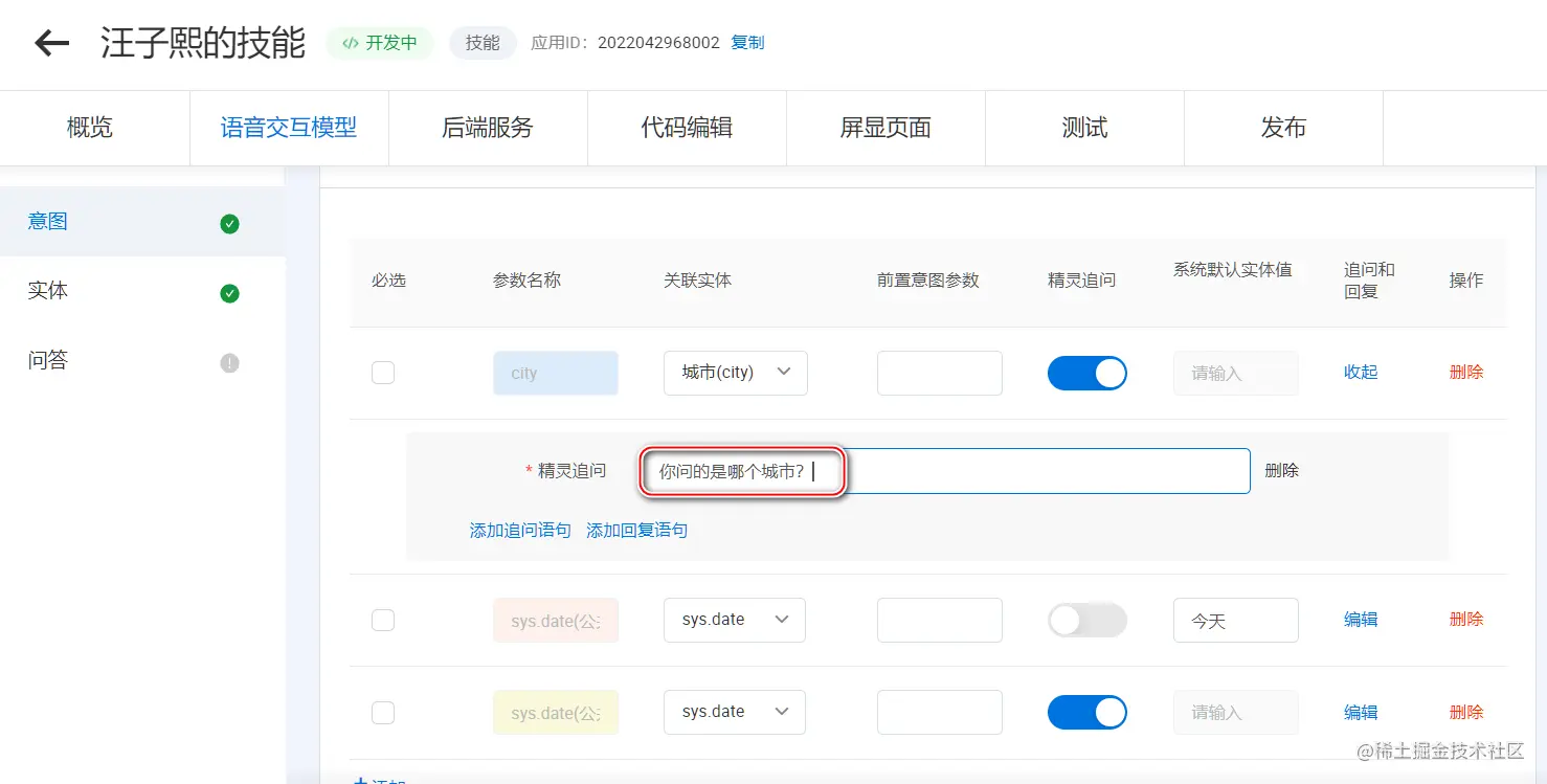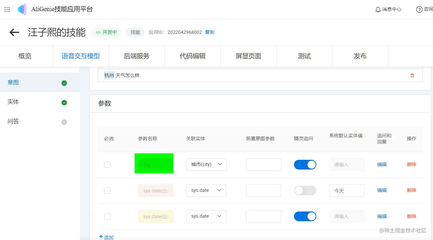 下图是 weather,天气预报意图的参数列表页面,其中 城市 的 id 为 city,我们可以在应用接口的代表中使用该 id,获取用户语音请求中包含的 城市 名称。