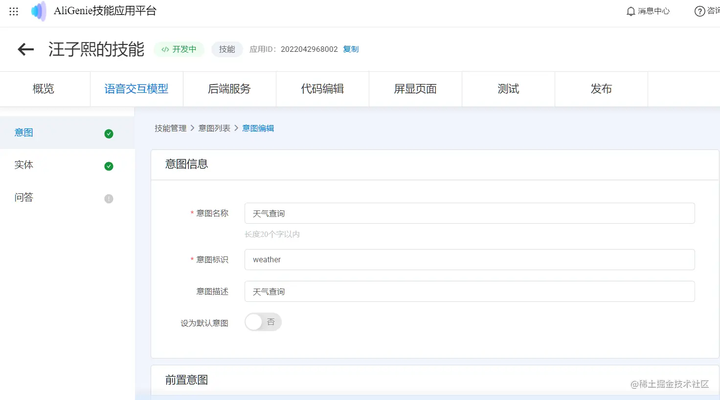 下图是天猫精灵的意图编辑界面。