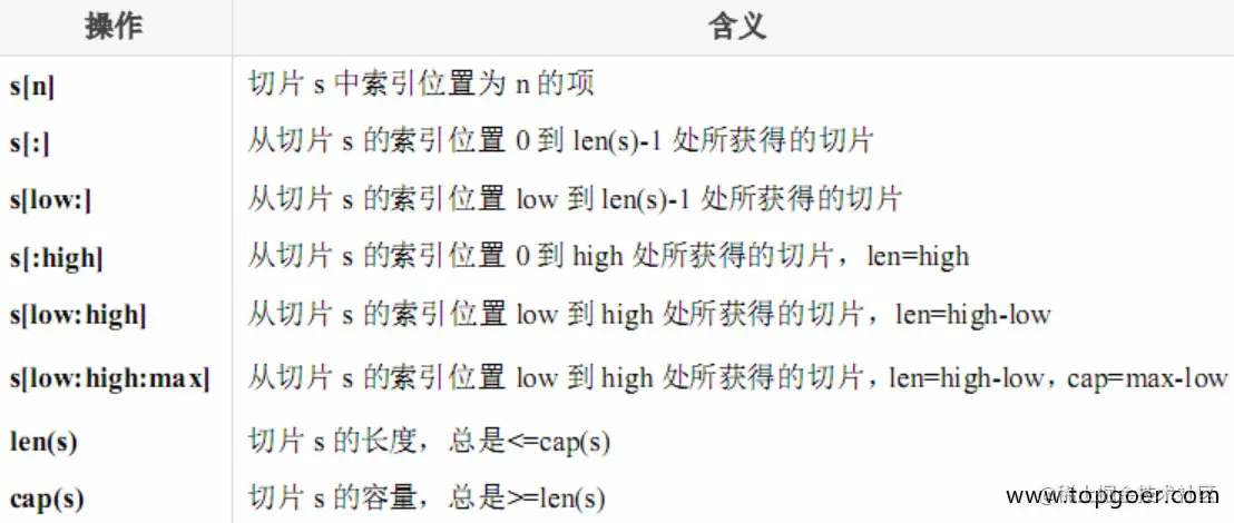 切片表达式从字符串、数组、指向数组或切片的指针构造子字符串或切片,它有两种变体:一种是指定low和high两个索引界限值得简单形式,另一种是除了low和high索引界限值外还指定容量的完整形式