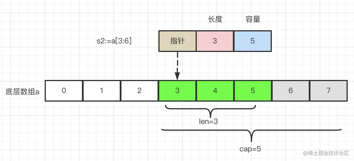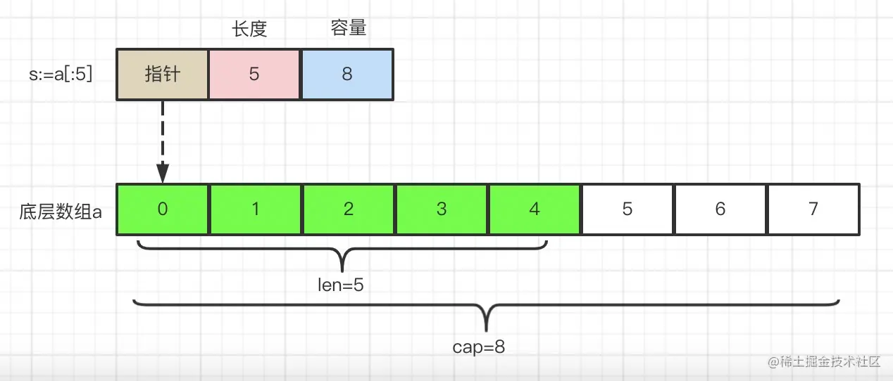 例:有个数组a := [8]int{0, 1, 2, 3, 4, 5, 6, 7},切片s := a[:5],示意图如下: