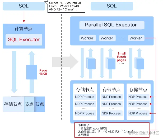 在全栈能力方面,GaussDB垂直整合华为软硬件资源,比如将华为在存储上的优势,深入融合到数据库的存算分离架构上,包括NDP(Near Data Processing)近数据处理,让数据库的计算逻辑充分利用下面整个存储池的能力,并且更进一步,将NDP与PQ(Parallel Query)相结合,提高复杂查询处理能力。
