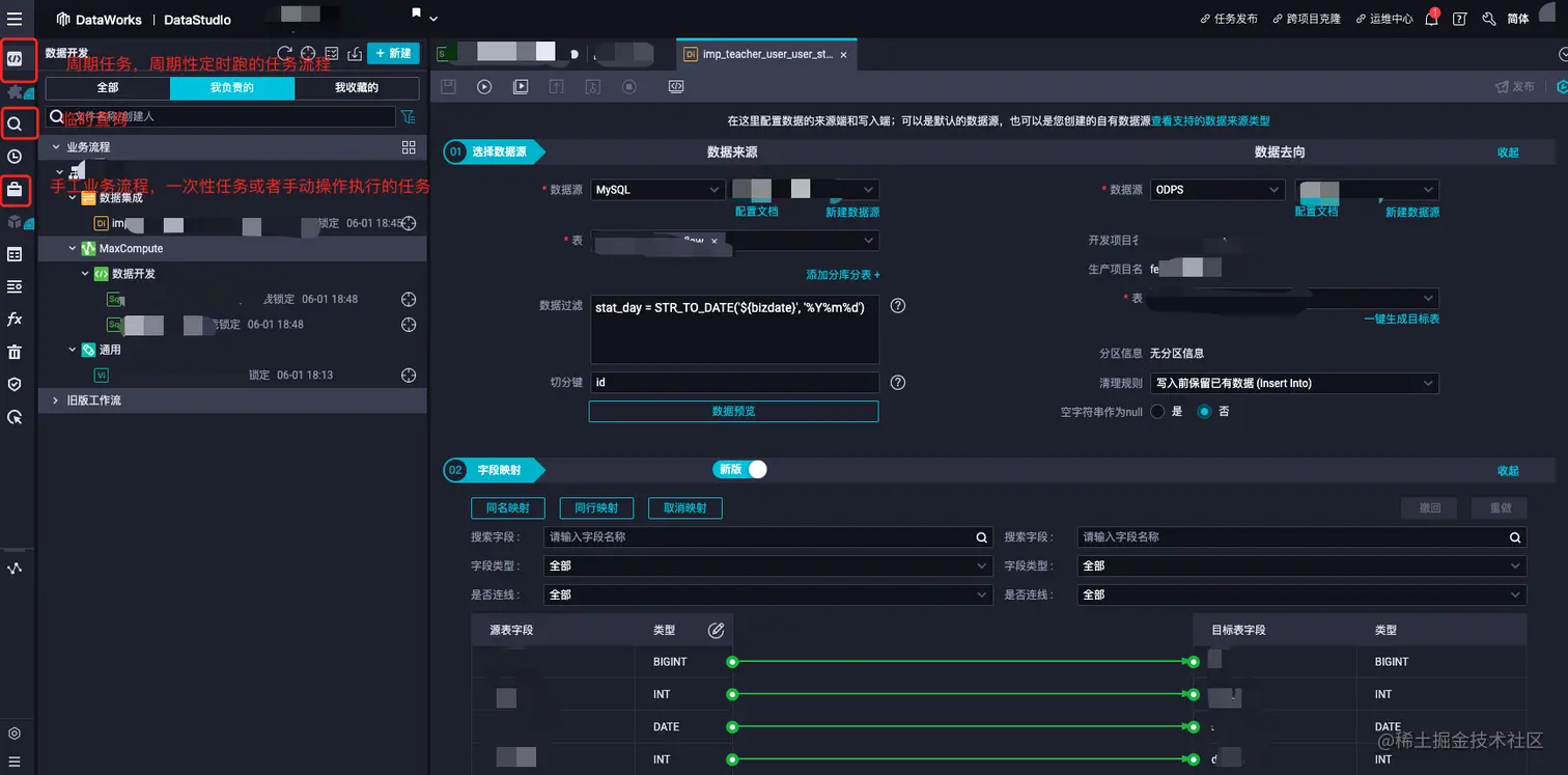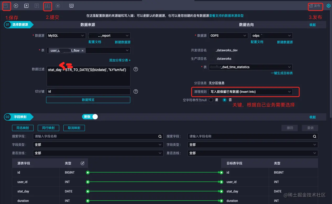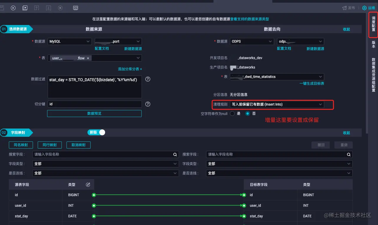 区别于手动流程的离线同步,这里的stat_day我们要取前一天的。刚才手工业务流程应该取<bizdate的,这里是=bizdate。 特别要注意,清理规则一定要设置成写入前保留已有数据。