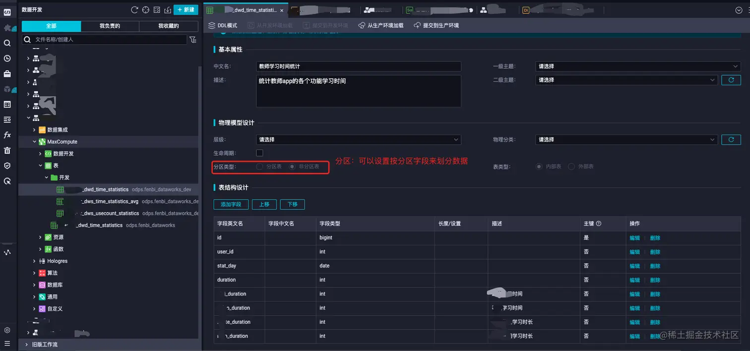 在离线同步数据前我们要先创建数据要导入到MaxCompute表,也可以导入过程中自动生成。具体创建如下,在表选中点击右键,选择创建新表,然后填写各自信息。这里要着重强调2个概念,一个是分区概念,一个是层级命名的规则。