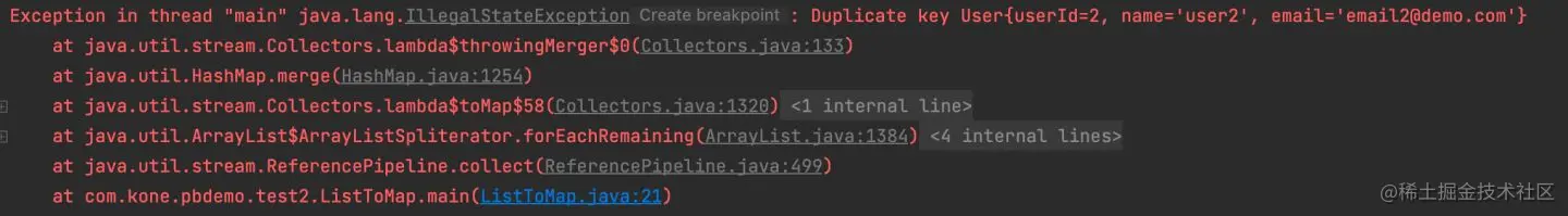 在转换过程中,如果出现相同的key,那么会抛出重复key的异常。