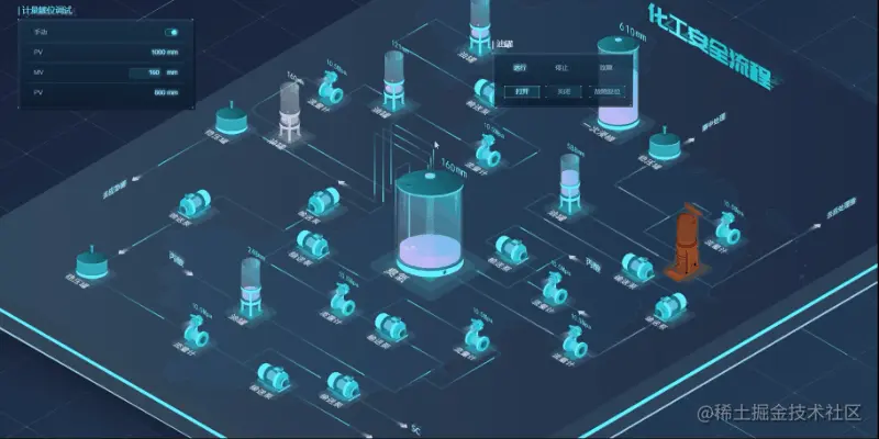监控平台对集成重点作业区域、装置位置分布及投入产出、产品产量、装置平稳率、装置负荷率等,搭载的智能感知设备,实时采集温度、压力、液位、有毒有害监测等关键参数。同时 2.5D 组态界面能清晰辨别工艺的流程的分布以及各个子流程的工艺走向,用户可根据设备甚至零部件的位置、颜色变化及时发现问题。实现对化工设备和生产装置运作状态多层面的可视化监控。