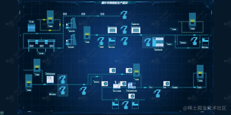 为了更有效辨别 2D 与 2.5D 之间的区别,图扑软件选用 2D 空调装配生产线与 2.5D 化工厂安全流程作比较。通过自主研发的 HT 产品,采用 B/S 架构快速搭建零代码拖拽式 Web 组态可视化场景,以真实的场景化、图形化、动态化的效果,反映二者运行状态、工艺流程、动态效果之间的不同。