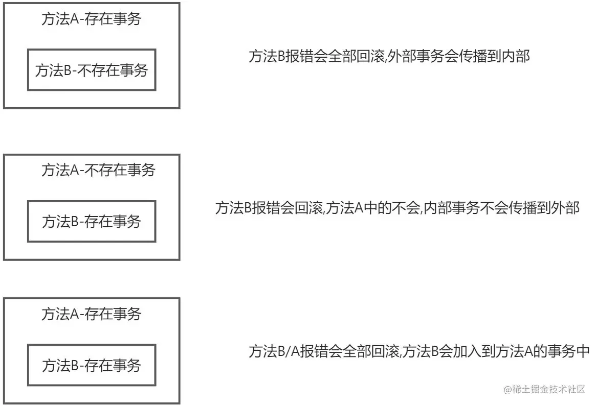 因为前段时间在找工作,加入掘金社区已经有一两个月了, 也没有发布多少文档, 其实不是我不想发布, 主要是我觉得, 搬运为其他社区, 平台的文章没有意义, 大家如果有喜欢的直接 百度搜索我的名字就可以 "彼岸舞" 博客园,CSDN,云+社区,51CTO 等等都有大量的文章, 今天有时间, 重新回顾了一下Spring的7大传播特性, 并且我画了图,便于李姐, 自我感觉还不错, 底部还有对领导的吐槽, 下次面试问我对加班的看法, 可以回复 mandatory, NEVER 哈哈哈