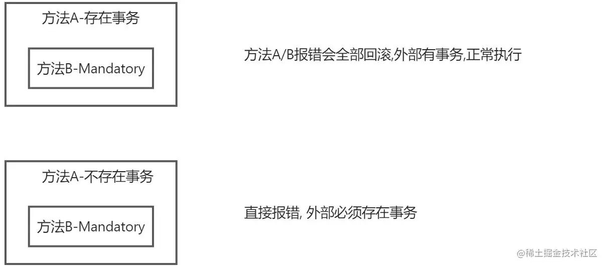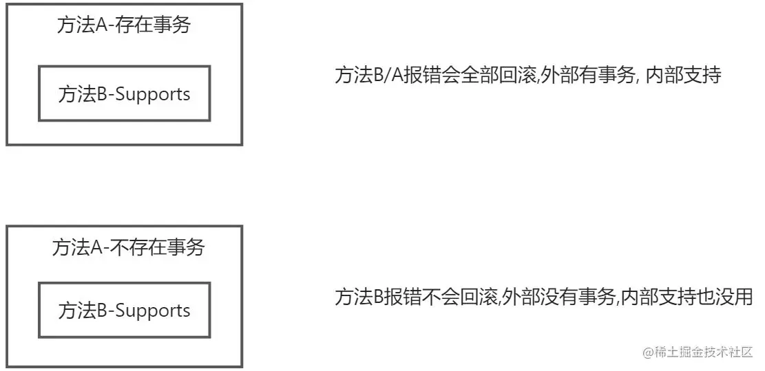 使用当前的事务, 如果当前没有事务,则自己新建一个事务,子方法是必须运行在一个事务中的, 如果当前存在事务,则加入当前事务, 成为一个整体
