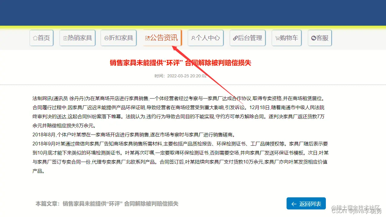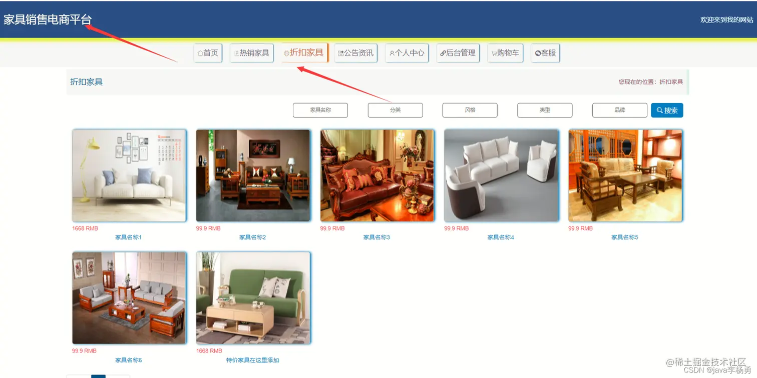 系统网站首页:在系统首页可以查看首页、热销家具、折扣家具、公告资讯、个人中心、后台管理、购物车、客服等内容