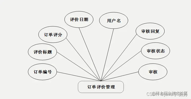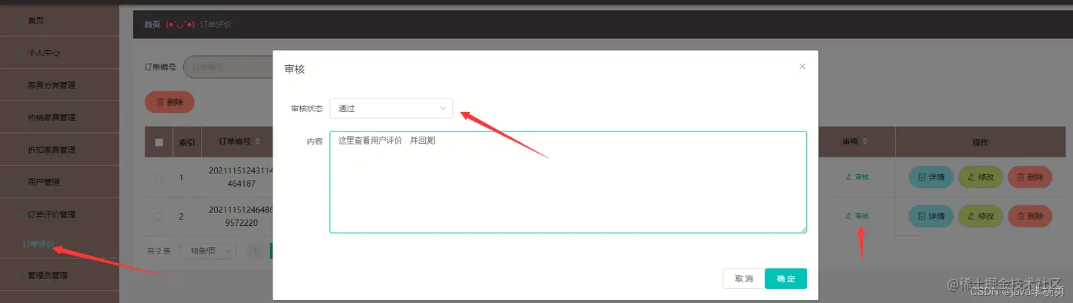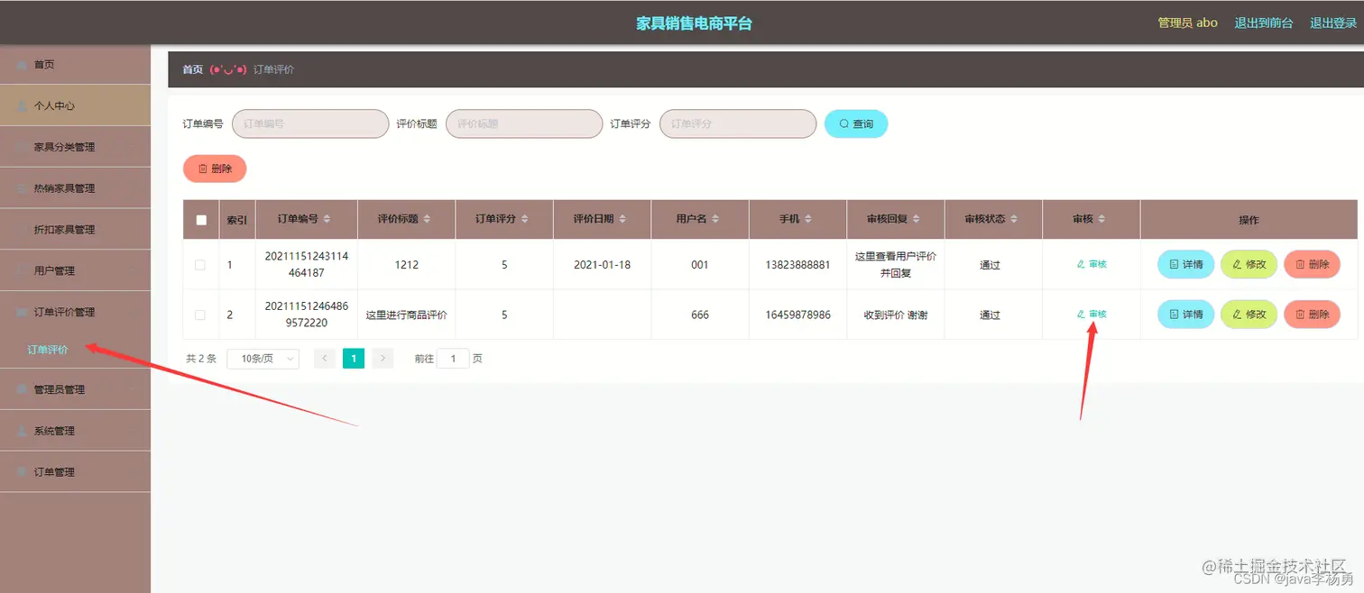 订单评价管理:订单评价管理:管理员通过列表可以获取订单编号、评价标题、订单评分、评价日期、用户名、手机、审核回复、审核状态、审核等信息,并进行详情、删除、修改操作如图所示