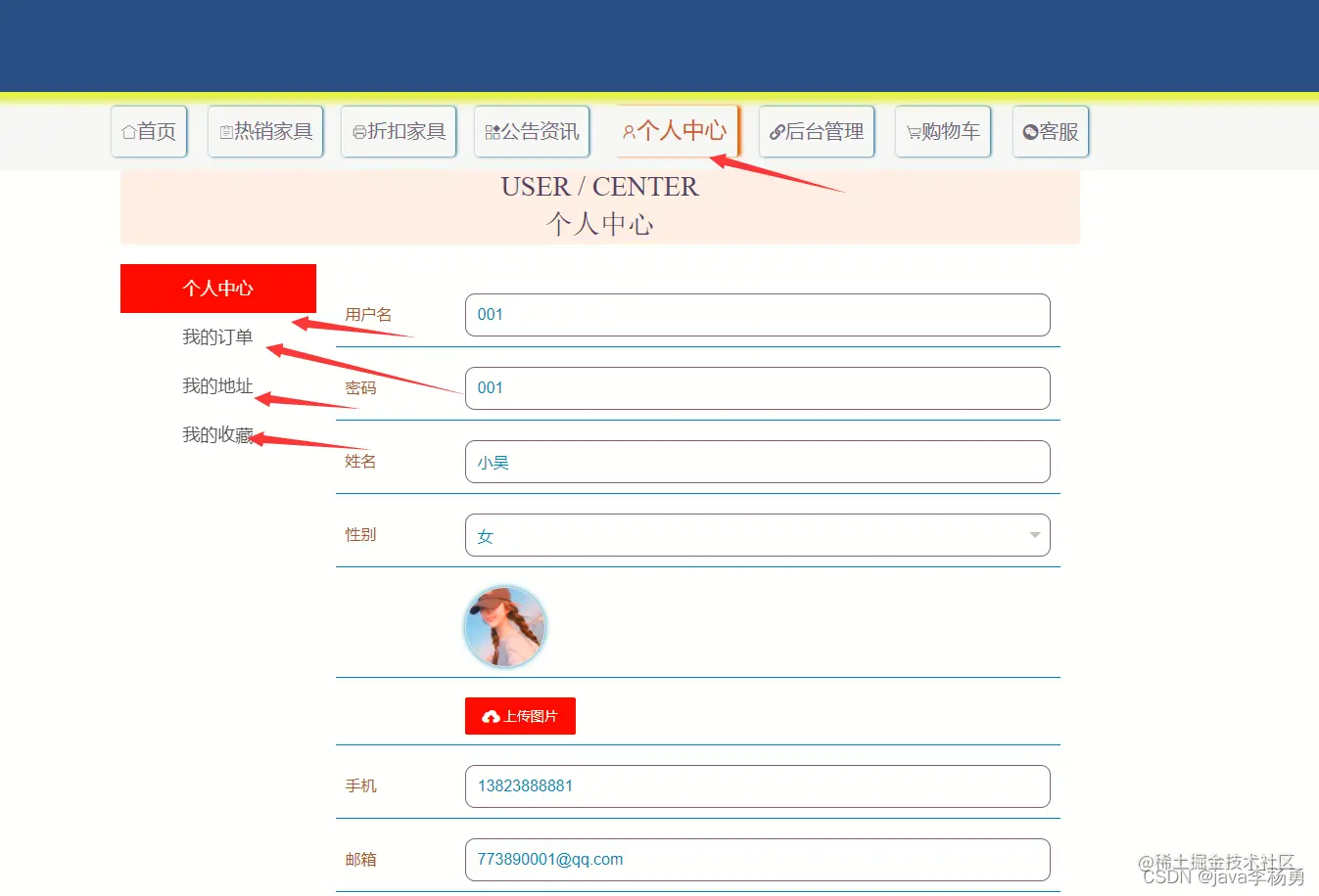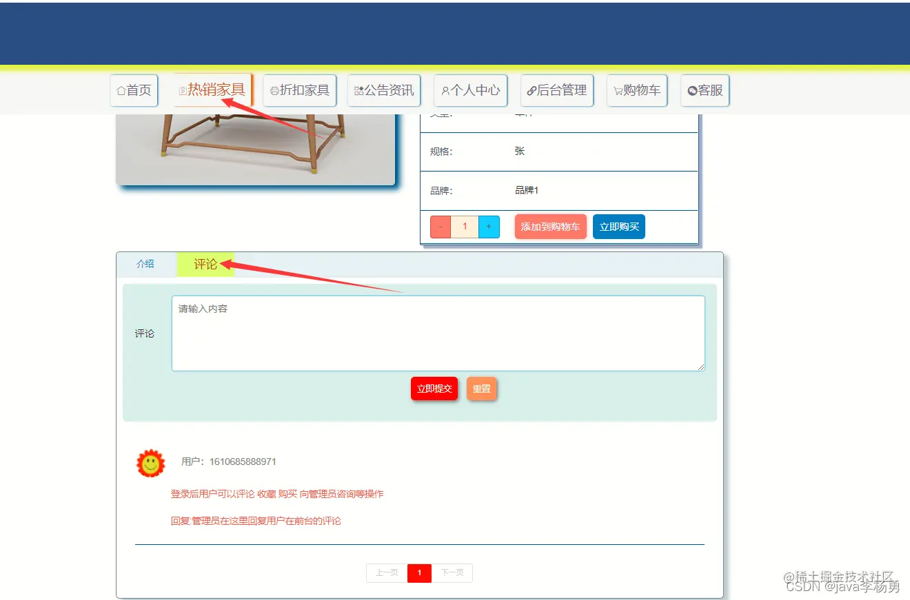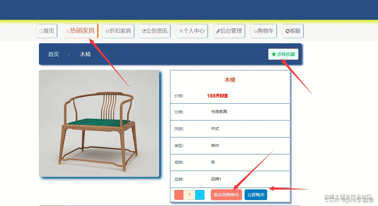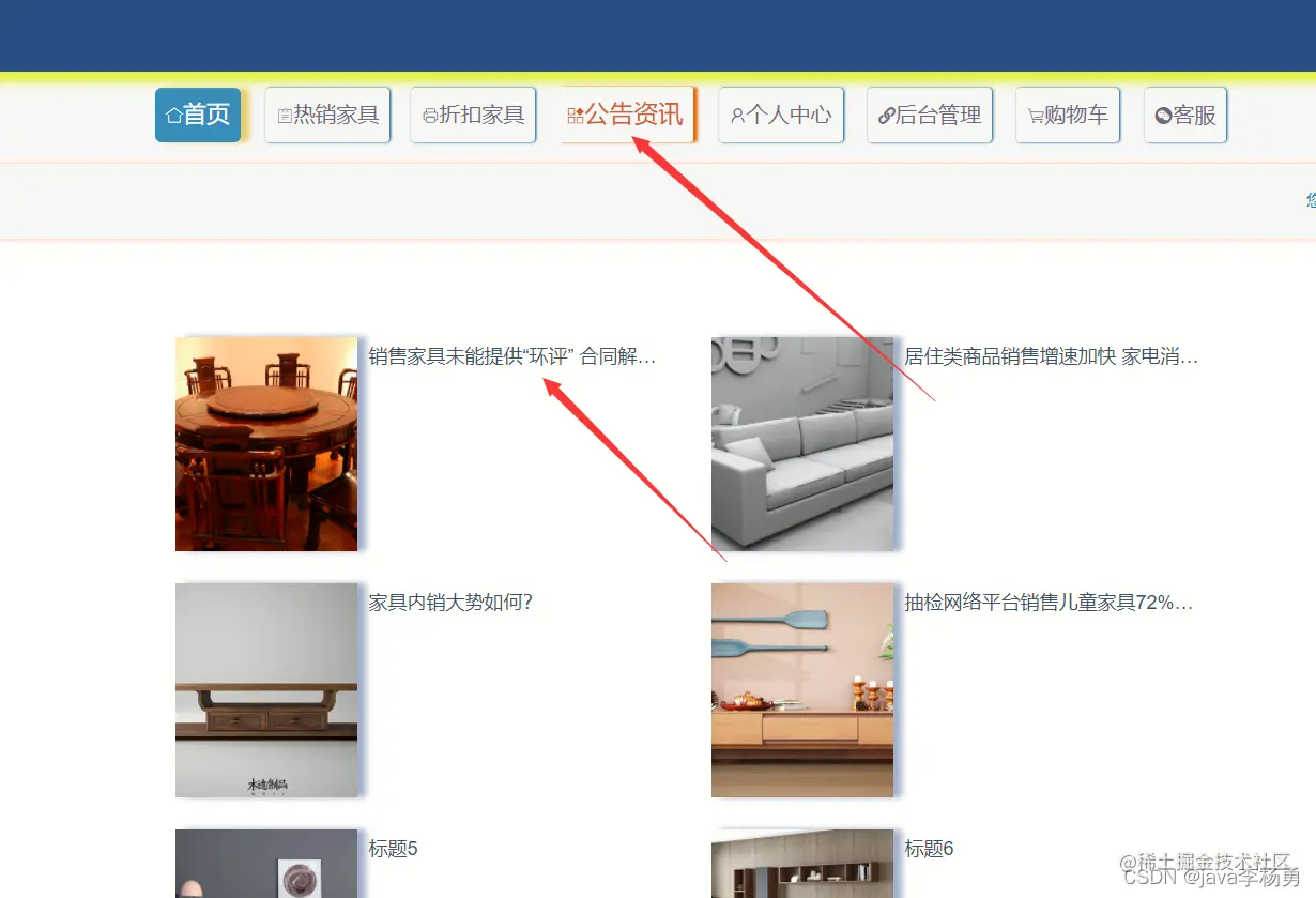 4、前台首页:首页、热销家具、折扣家具、公告资讯、个人中心、后台管理、购物车、客服等相应操作;