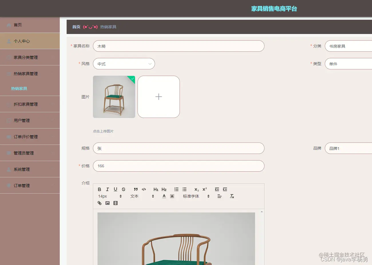 家具商品详情:热销家具,在热销家具页面通过填写家具名称、分类、风格、类型、图片、规格、品牌、价格等信息进行立即提交,如图所示。