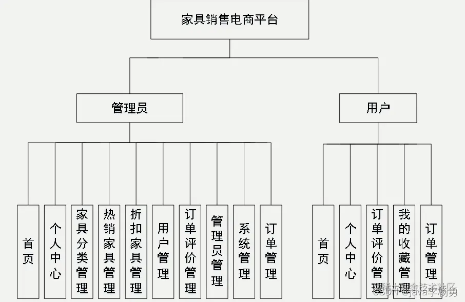 家具销售电商平台,主要包括管理员、用户二个权限角色,对于用户角色不同,所使用的功能模块相应不同。本家具销售电商平台结构,如下图所示。