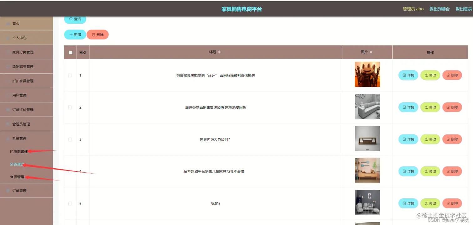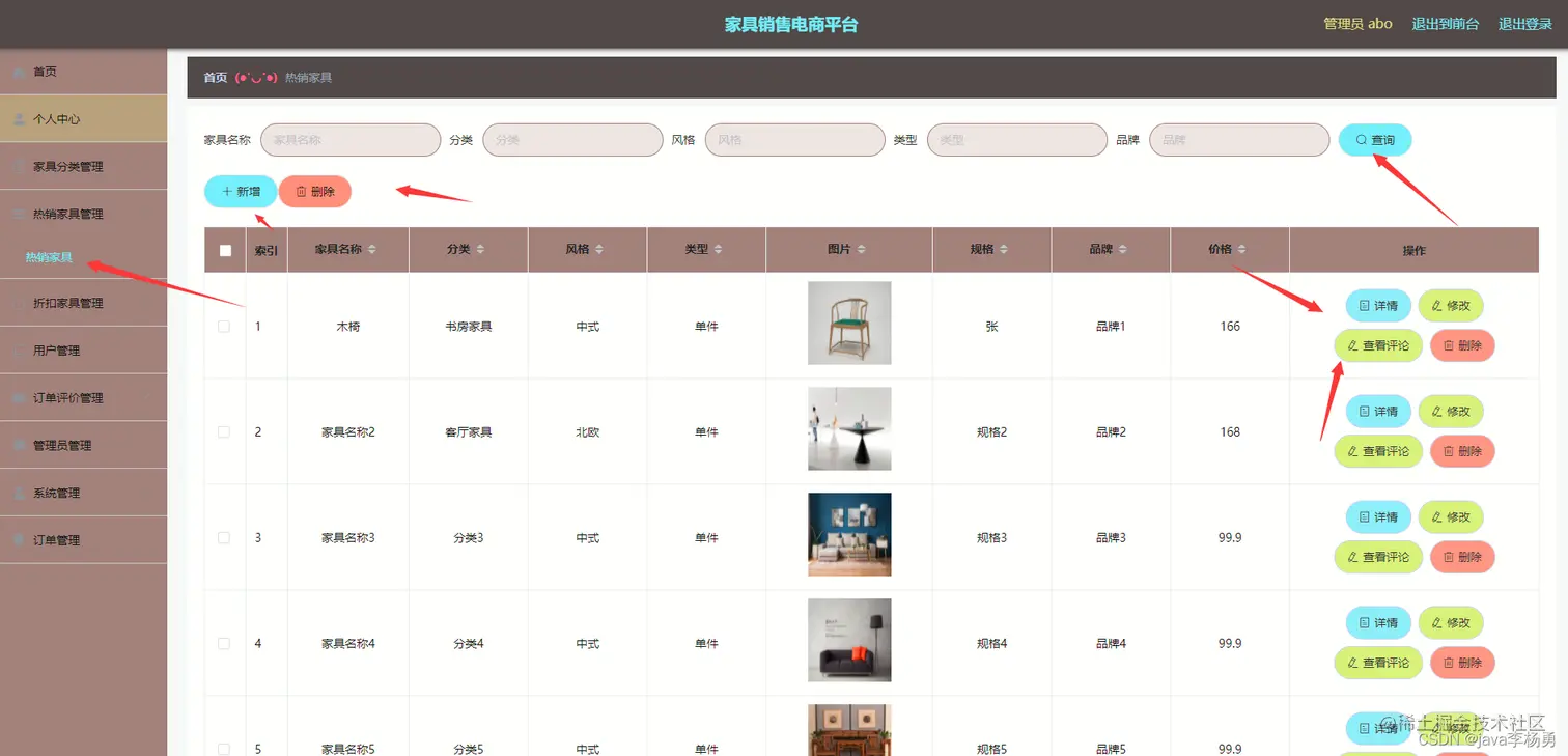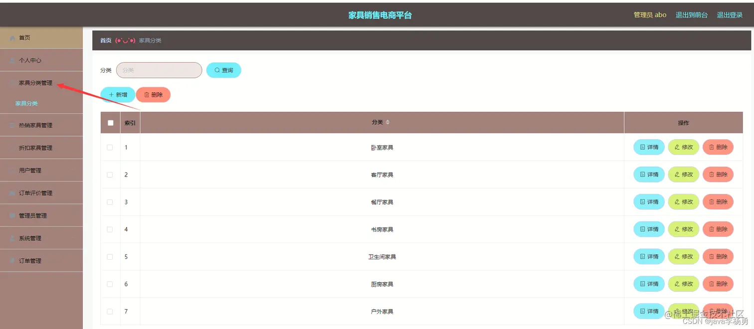 家具详情:管理员通过列表可以获取家具名称、分类、风格、类型、图片、规格、品牌、价格等信息,并进行详情、删除、修改操作,如图所示。