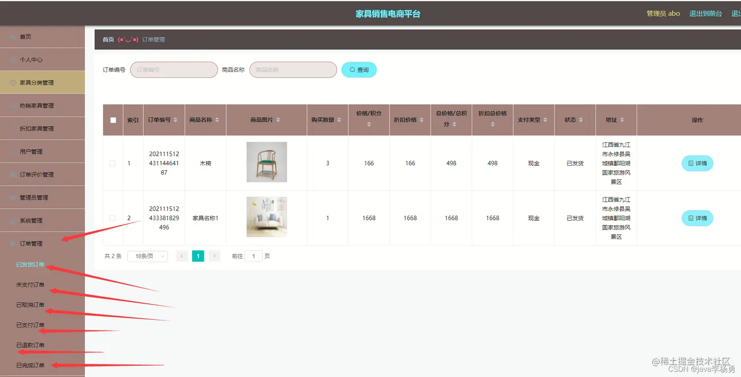 2、管理员;首页、个人中心、家具分类管理、热销家具管理、折扣家具管理、用户管理、订单评价管理、管理员管理、系统管理、订单管理等。