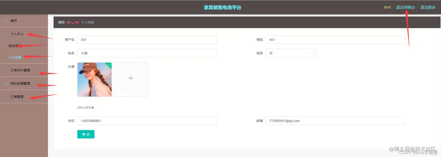 个人中心模块:在个人中心可以查看修改个人信息、查看订单信息以及收货地址和收藏等模块的管理查看操作。