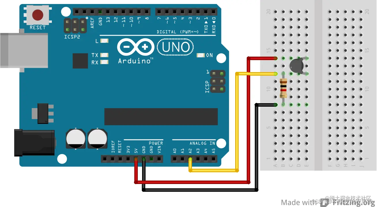将热敏电阻与10KΩ电阻串联起来,热敏电阻另一端接至Arduino Uno控制板上的+5V,10KΩ电阻另一端接至Arduino Uno控制板上的GND上,将热敏电阻与10KΩ电阻的连接处接至模拟引脚A2上,如下图所示: