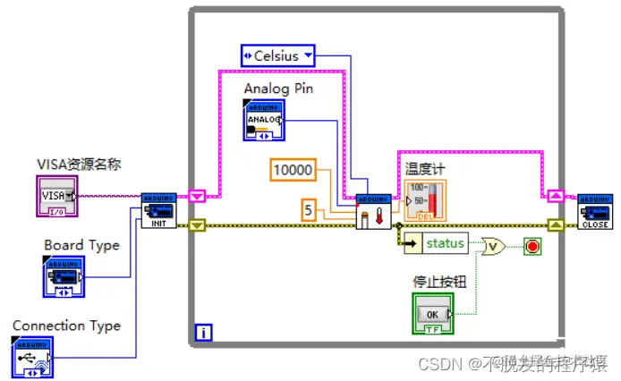 LabVIEW程序首先通过设置的串口号与Arduino Uno控制板建立连接,然后进入While循环中,在循环中不断调用热敏电阻专用的Thermistor Read函数节点来读取温度值。最后,断开与Arduino Uno控制板的连接。