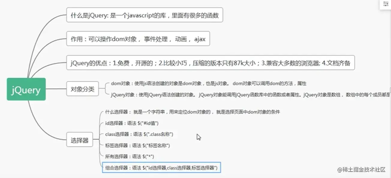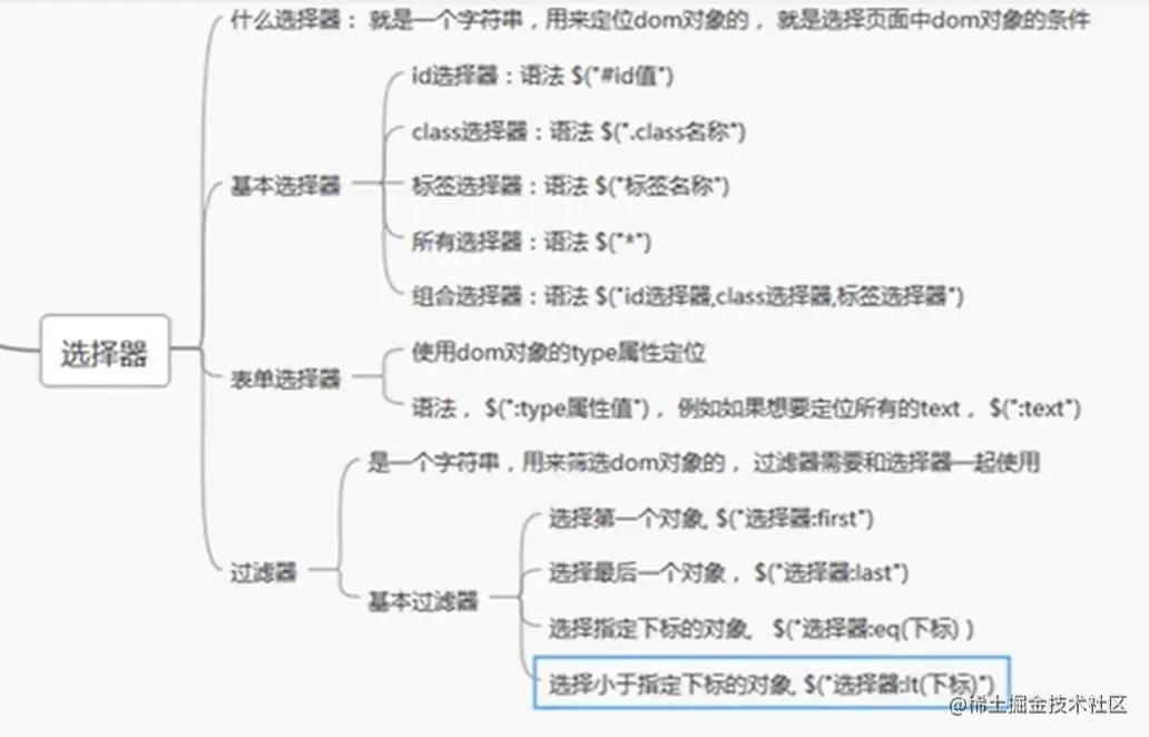 - 选择器就是一个字符串,是用来定位dom对象的。定位了dom对象,就可以通过jquery的函数操作dom对象。