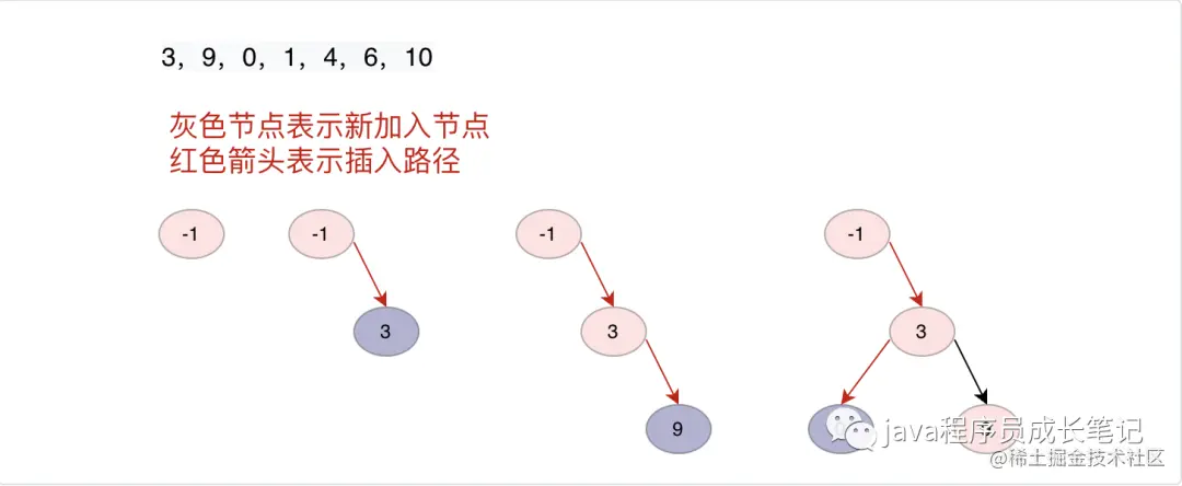 从头节点开始我们遍历二叉搜索树,如果当前节点值小于等于插入节点值,则插入节点在当前节点的右子树上,否则在左子树上,一直深度遍历知道当前节点的右子树(左子树)为空,则插入。