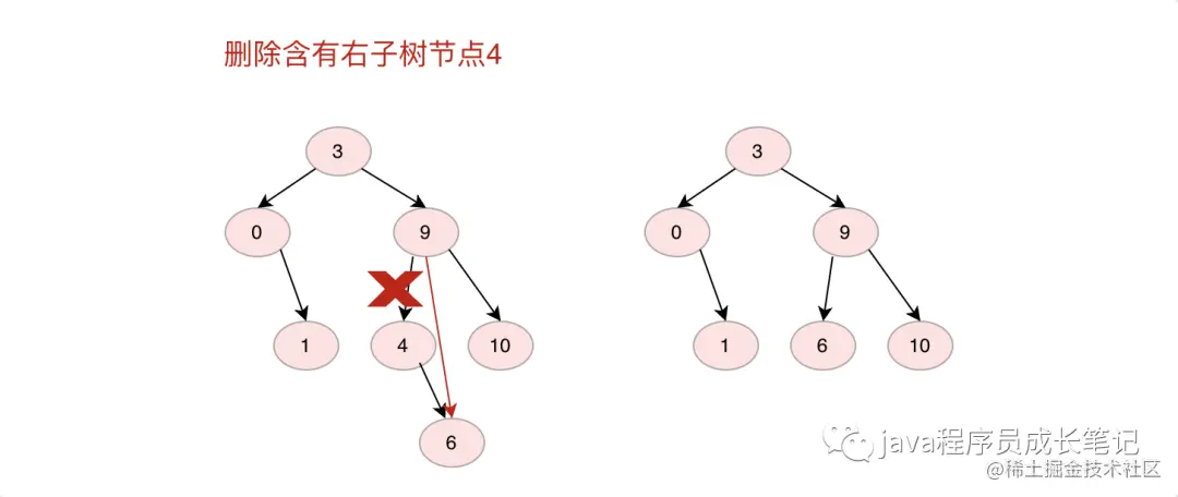 2.如果删除的节点只有左子树或者右子树,则直接将左子树或者右子树节点放在删除节点位置