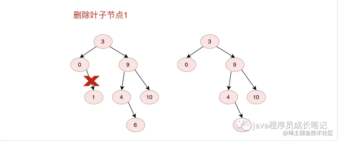 删除节点时候我们需要先找到删除节点的位置,然后做对应操作。有三种情况:1.如果删除的是叶子节点直接删除