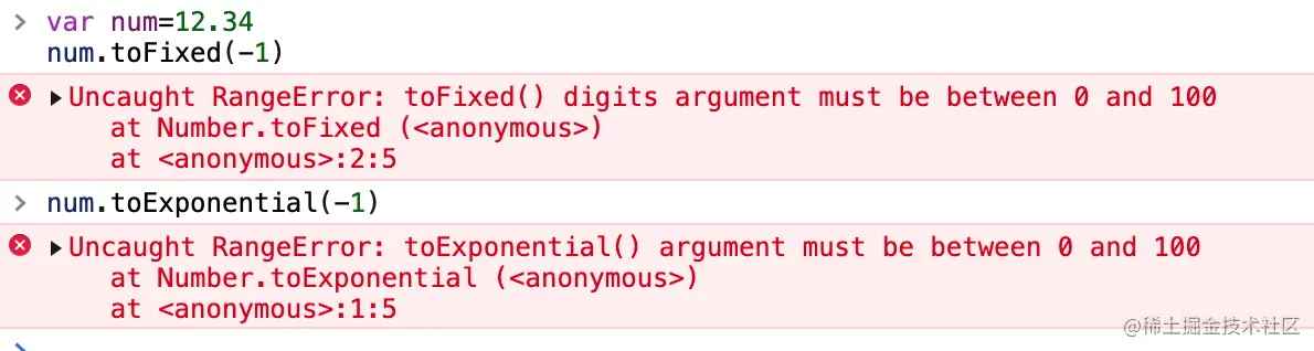 num.toExponential(-1); // Uncaught RangeError: toExponential() argument must be between 0 and 100