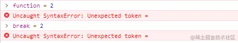 break = 2; // Uncaught SyntaxError: Unexpected token '='