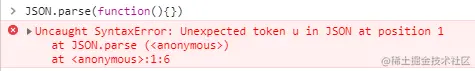 JSON.parse(function() {}); // Uncaught SyntaxError: Unexpected token u in JSON at position 1