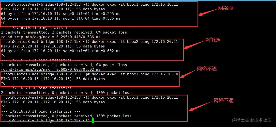 通过验证,bbox1 和 bbox3,bbox2 和 bbox4 在同一 macvlan 网络下,互相可以 ping 通,bbox1 和 bbox2,bbox1 和 bbox4 在不同的 macvlan 网络下,互相 ping 不通。