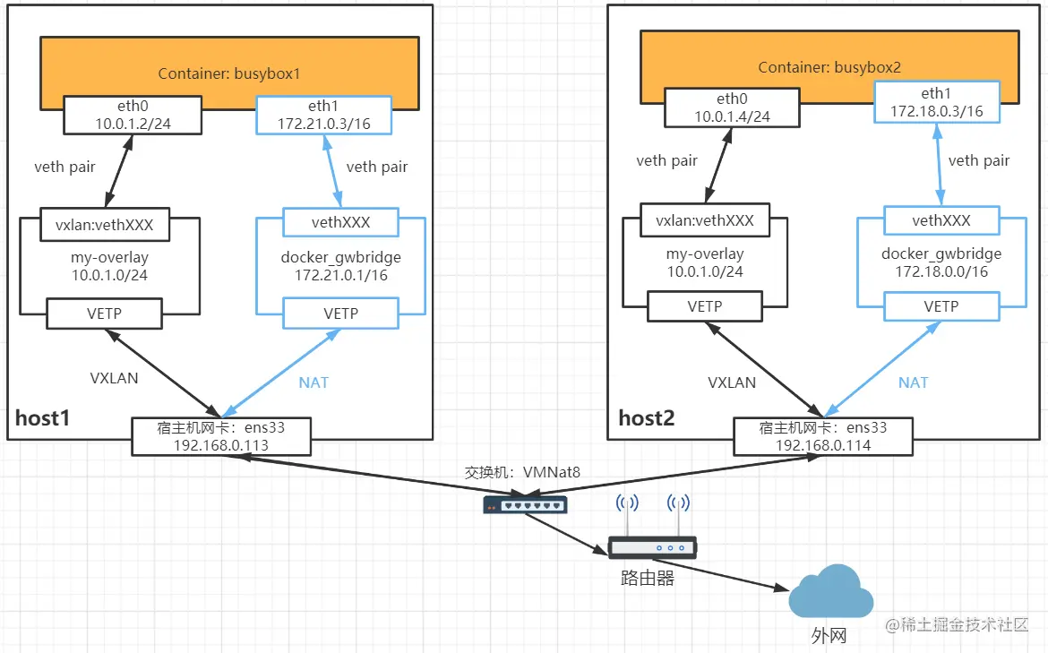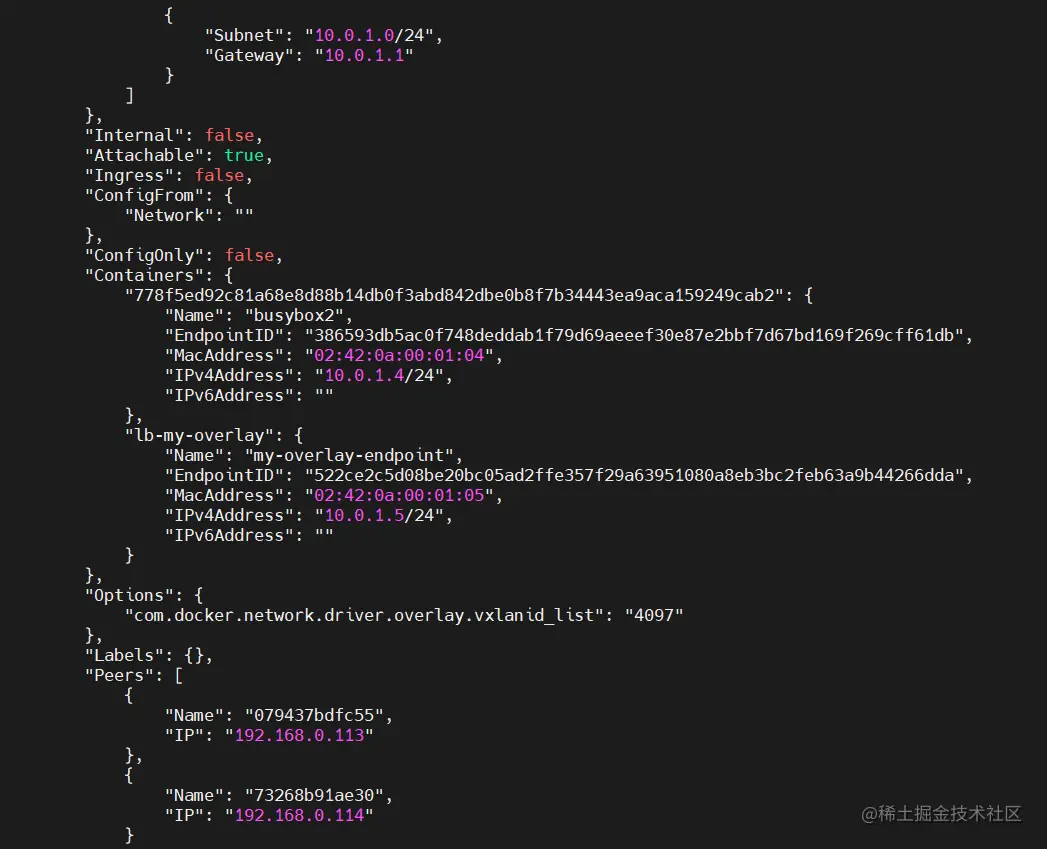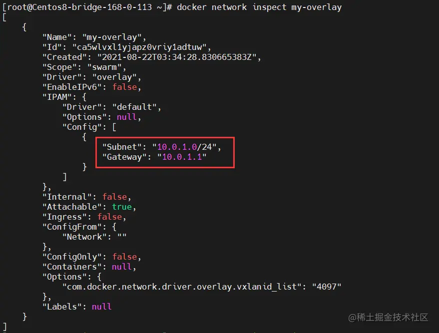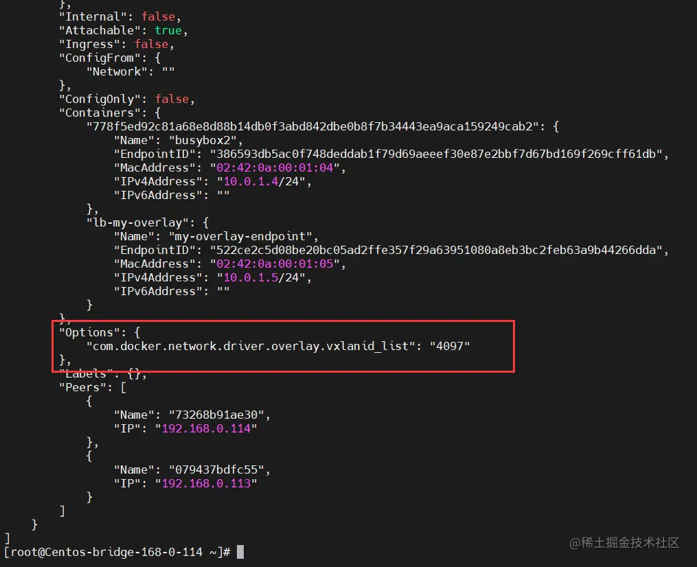 其实从上图看,可能有朋友会发现,为啥有vxlan的标注,因为vxlan才是实体,overlay只是网络模型;一句话就是vxlan是overlay网络的一种实现,如果不清楚vxlan的,可以看这里。 其实可以查看my-overlay网络的具体信息,里面会有vxlan的一些参数