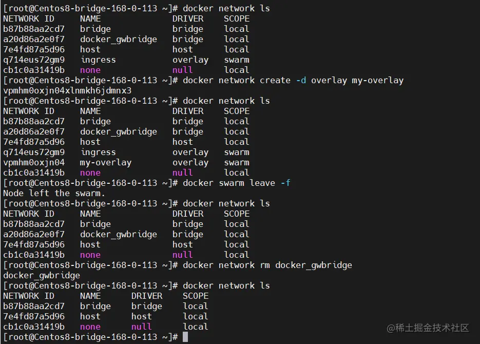 # 删除集群节点,因为上面初始化了,相对于删除了集群了,删除集群后会自动把swarm网络删掉,所以这里只需要手动删除docker_gwbridge。