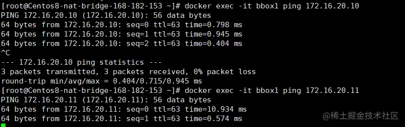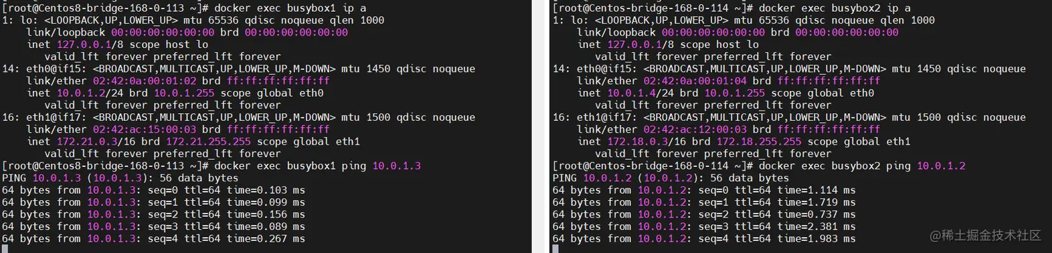 8)在上面刚创建的2个容器内互相PING对方做测试