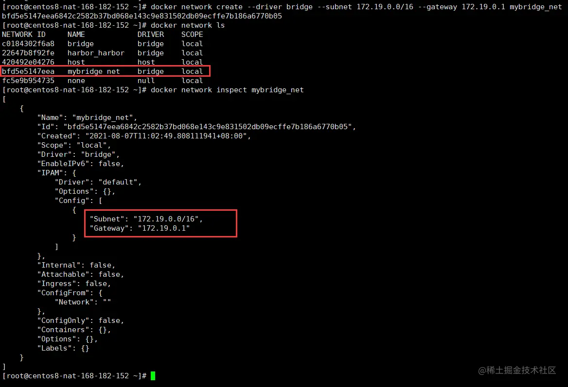 参数解释: --driver bridge 表示使用桥接模式 --subnet 172.19.0.0/16 表示子网ip 可以分配 172.19.0.2 到 172.19.255.255 --gateway 172.19.0.1 表示网关 mybridge_net 表示网络名