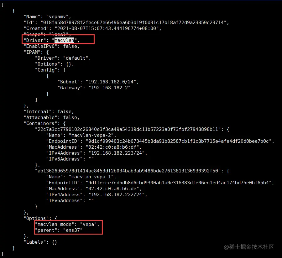 查看网络信息,可以看到驱动类型为macvlan,macvlan模型为vepa,两个网卡有独立的mac地址,底层物理网卡为ens37