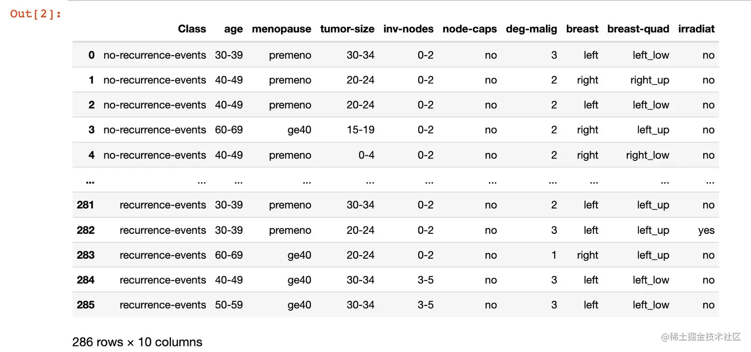 df = pd.read_table("breast-cancer.data",