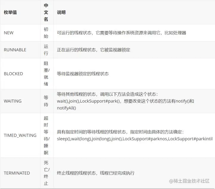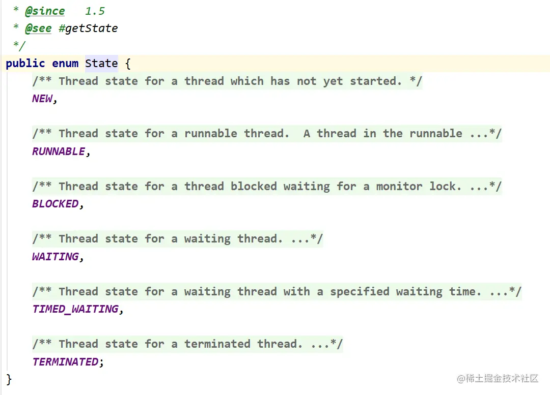 在源码中线程的状态是使用内部的枚举来表示的,一共为6种状态。大家可以稍微看下源码的,英语不好的同学可以吃下回锅肉: