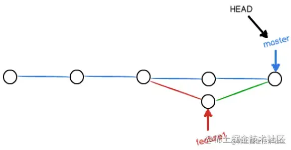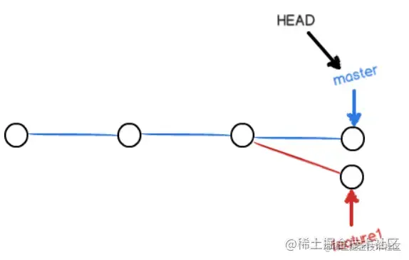 此时,master分支和feature1分支各自都分别有新的提交,变成了下图所示: