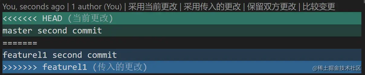 git用<<<<<<<,=======,>>>>>>>标记出不同分支的内容: