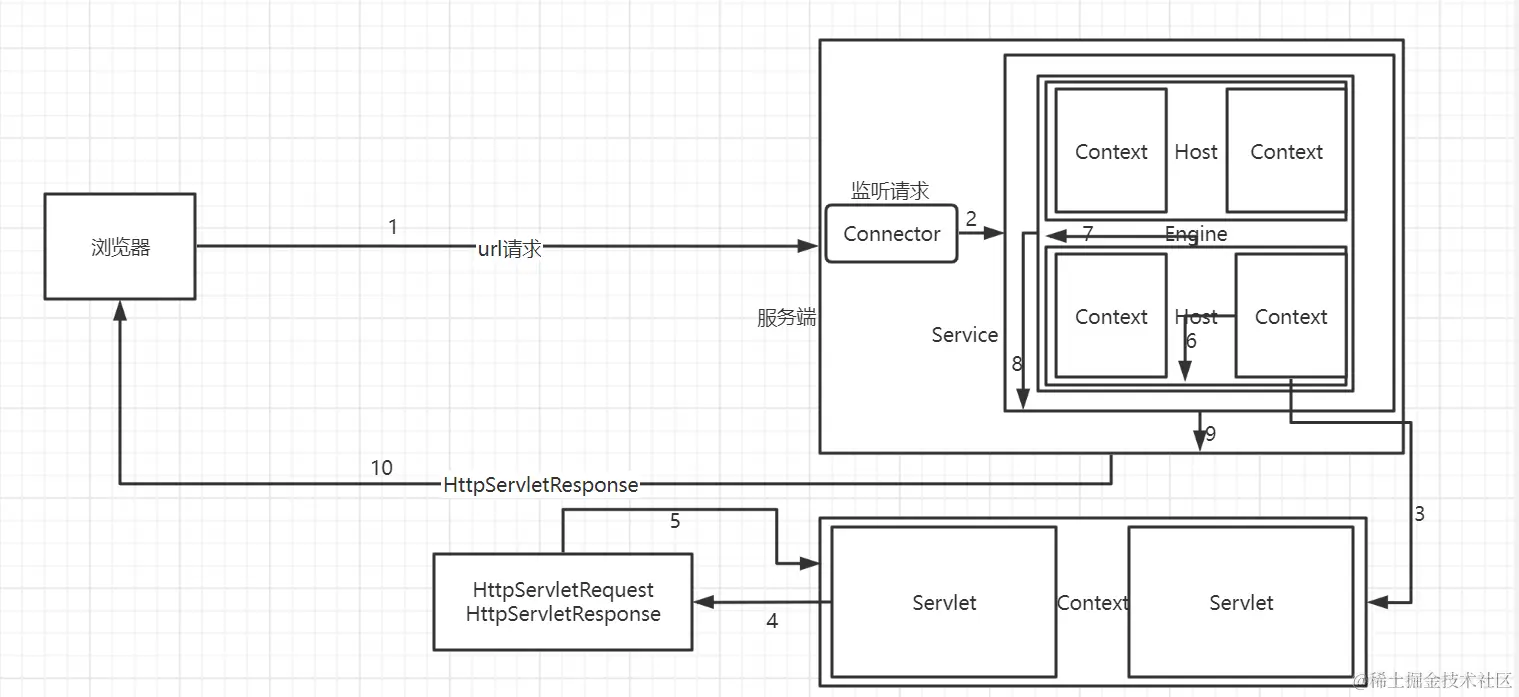 - 浏览器发送url给后端默认端口为80,被在端口处监听的Connector捕获。