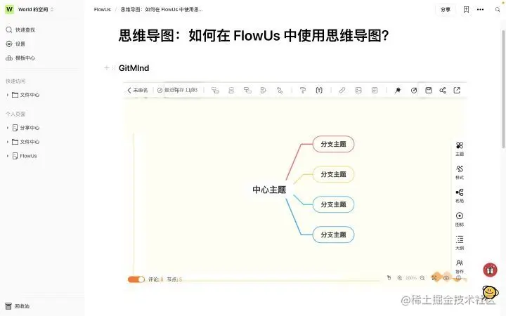 这些思维导图工具固然强大,然而对于思维导图的目的应该是辅助思考。作为一名轻度思维导图用户,我并不想下载思维导图客户端。那么,如何在不下载客户端的情况下,将思维导图整合至自己当前的工作流之中呢?我目前的主要笔记类工具是 FlowUs, 这是一款具有可以作为在线网盘的文件夹页面功能以及原生开发极速体验的生产力工具。由于 FlowUs 目前没有官方的思维导图功能或者视图,那么,我如何在 FlowUs 中使用思维导图呢?实现这一目标的解决思路有两个:1. 嵌入思维导图生成的图片;2. 嵌入思维导图网址。从我的理念来看,我放弃了第一种解决方案。这是因为,无论是我们的阅读,还是写作,往往都是非线性的。我们经常需要返回思维导图工具对已有的思维导图内容进行修改。如果采取第一种方案,这意味着我经常需要重新删除图片,再从思维导图生成新的图片,再此上传至 FlowUs. 这样的工作流并不是高效的。因此,我选择嵌入思维导图网址作为我的解决方案。为了实现这个目标,需要满足以下条件:1. 使用具有网页版的思维导图服务;2.嵌入页面可以直接显示思维导图内容,而不是仅仅嵌入网址书签。其中,满足第一个条件比较容易。但是满足第二个条件的工具则很少。在同类软件中,Notion 中可以采用 Miro、Whimsical 等工具进行嵌入。然而,这是两款国外应用。绝大多数国内应用并没有对接这两个第三方服务。对于 FlowUs 而言,其支持嵌入 ProcessOn, 但是需要登录才能显示相关内容。有没有更好的解决办法?有,建议使用 Gitmind. 这是一款超级良心的思维导图工具,具有全平台、设计优美、功能强大等特点。更为重要的是,Gitmind 同时也是一款免费应用。具体操作如下: