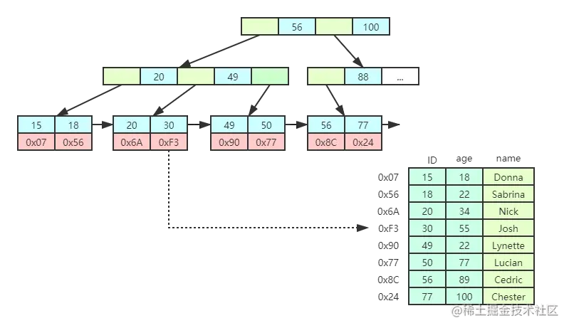 - 第三项22:等于22,符合要求,获取主键id=49,去主键索引树中检索id=49的数据放入结果集中。(回表:3次磁盘IO)