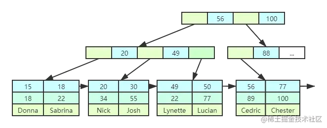 - 向后遍历底层叶子链表,将下一个节点加载到内存中,遍历比较。(1次磁盘IO)