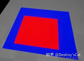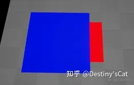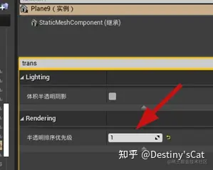 如果想让红色的材质在蓝色之上,就需要在面片的属性中找到半透明排序优先级(Translucency Sort Priority),并将其数值设置为 1(或者大于蓝色面片的值),此处建议所有的场景半透明物体有更好的规划,层级有一定的顺序,不建议数值过大。
