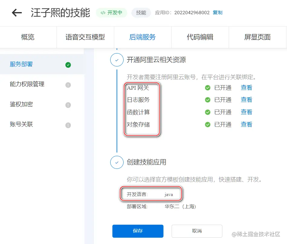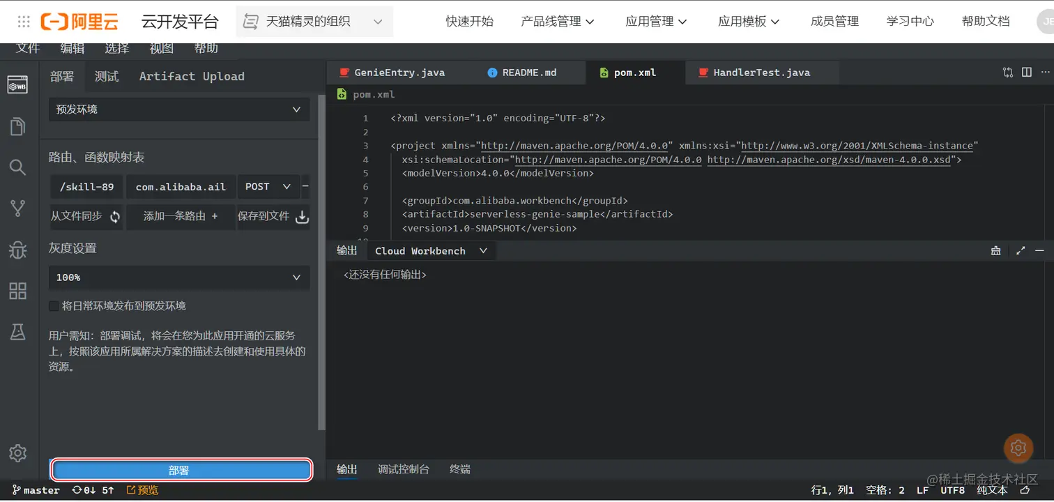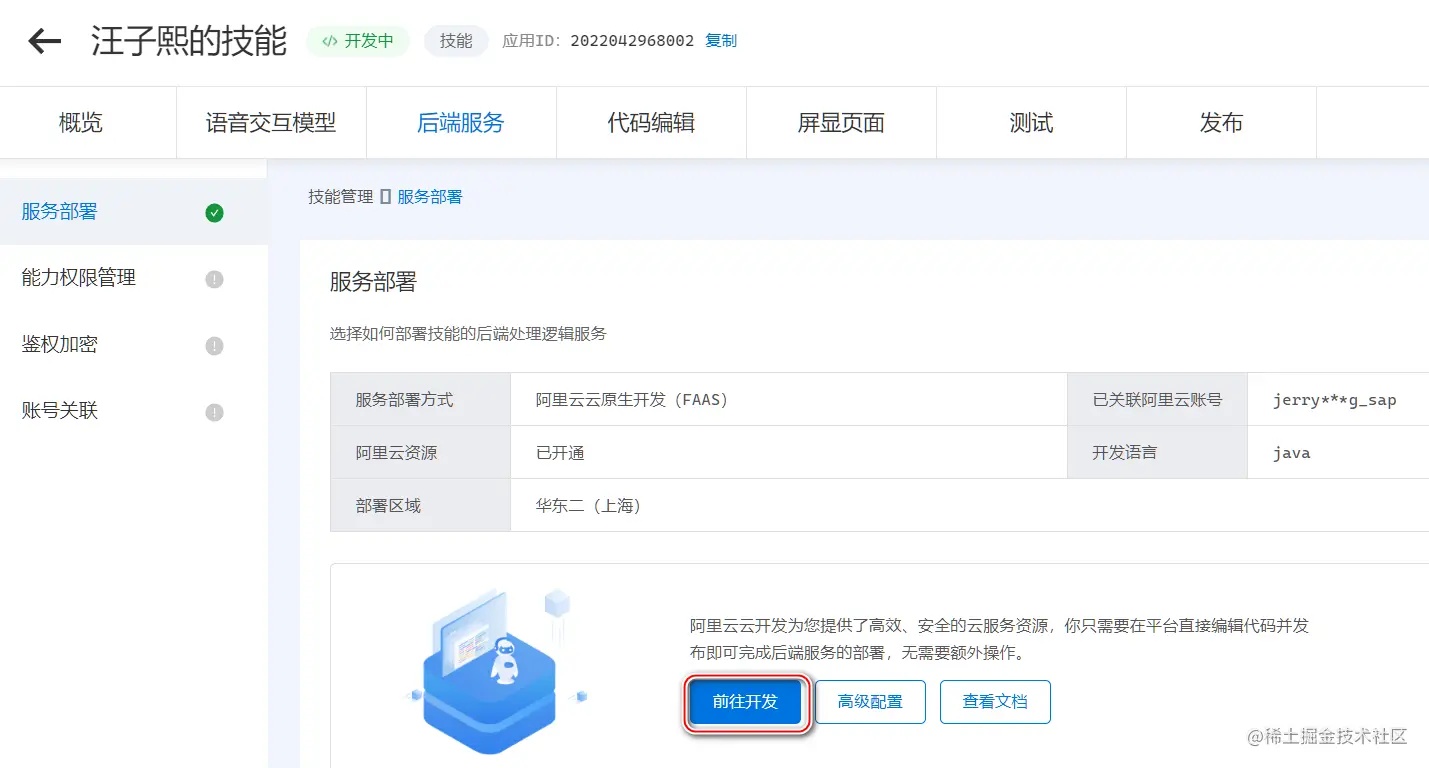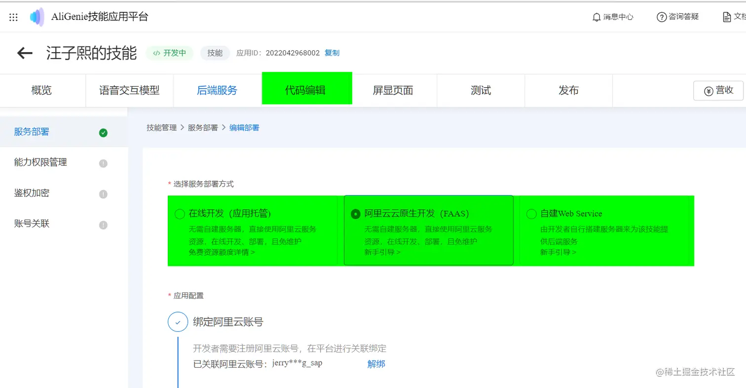 技能的后端编码是天猫精灵自定义技能开发的重头戏。点击 代码编辑 面板,可以为该技能针对的业务接口实现,选择对应的服务部署方式。