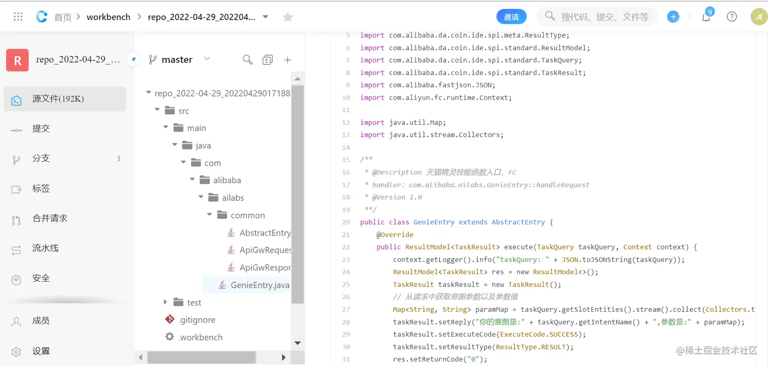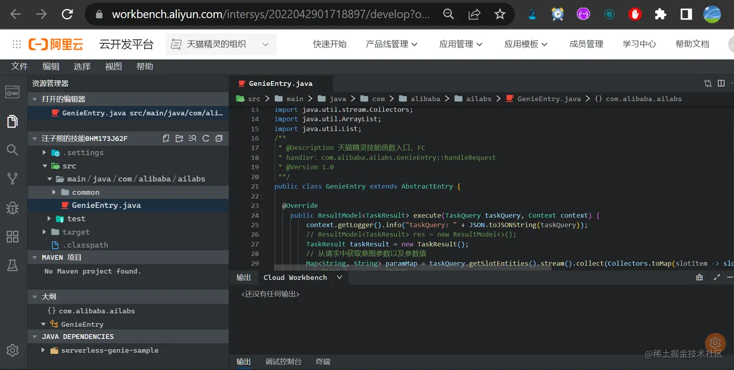接下来,就可以在 Cloud IDE 基于模板生成的项目里,通过实现 GenieEntry 的 execute 方法,来编写自定义技能的业务逻辑了: