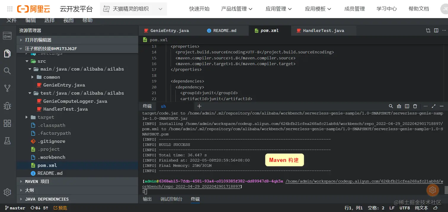 在 Cloud IDE 里能完成绝大多数常规的开发操作,比如代码编辑,git 代码仓库提交,Maven 构建,一键部署等等: