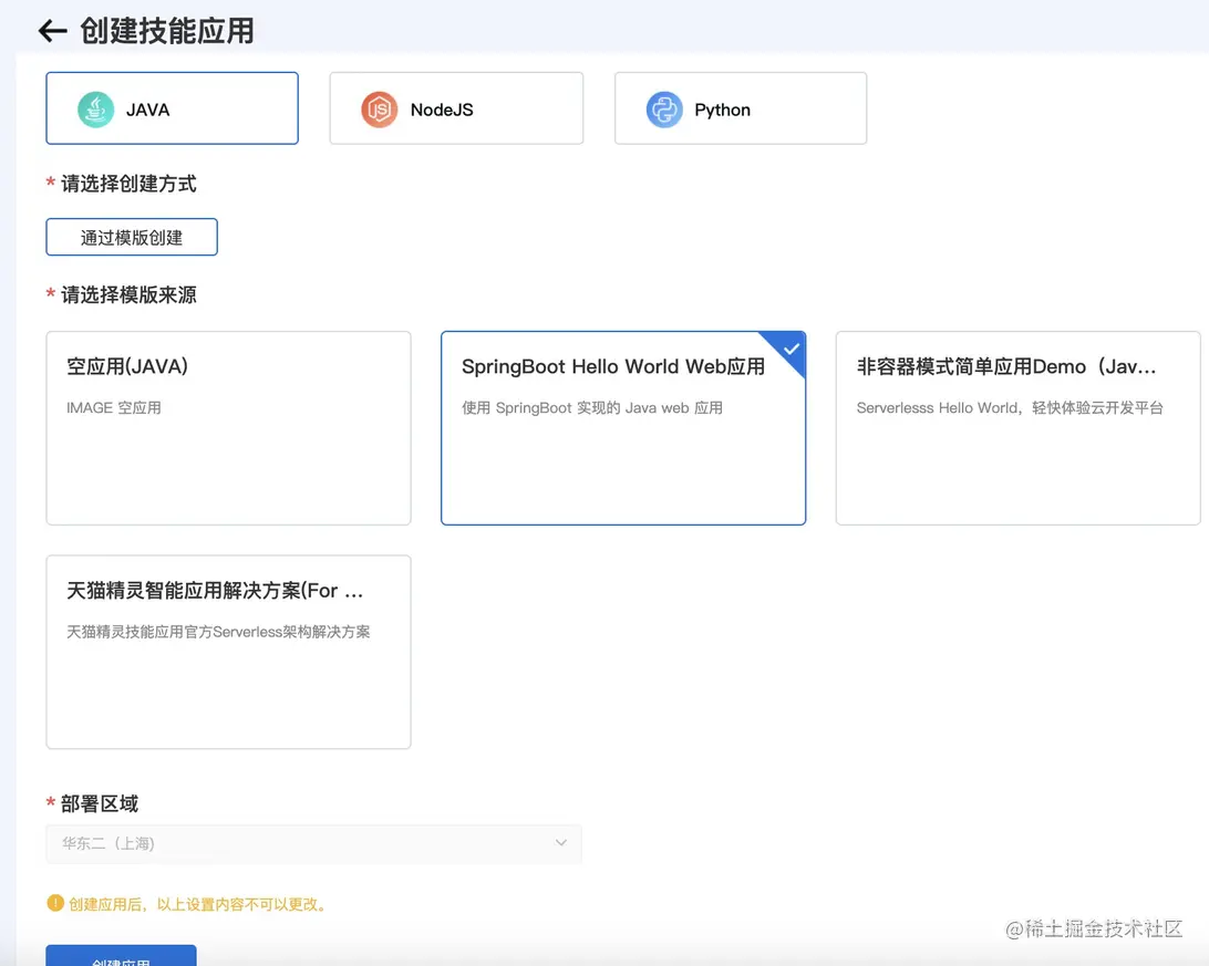 依次开通 API 网关,日志服务,函数计算,对象存储四个资源后,基于 Java Spring Boot 应用模板,快速创建一个服务实现: